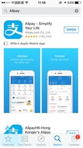 Until now, Alipay App is only available on smartphones with iOS, Android or Windows phone system. You can search “Alipay” or “支付宝” in your App store, Google Play Store or Microsoft Store to download the App. (Attention: We do not recommend Windows Phone users to use the App as it was not updated since July, 2012 until June, 2018 in Microsoft Store.)