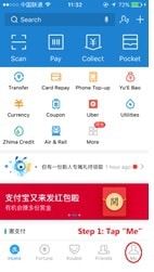 Step 1: Open Alipay App, Tap “Me” at the bottom right corner of the page.