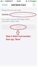 Step 4: Enter your Chinese bank card number. Then, tap “next”.