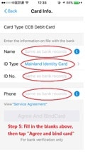 Step 5: Fill in your name shown on your Chinese bank card, select your ID type, enter your ID Number and type in your mobile number which has been recorded by the bank. In the end, tap “Agree and Bind Card”. Alipay right now only accept the following types of ID:
