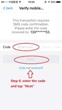 Step 6: Enter the confirmation code received from SMS. Then tap “Next”.