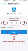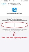 Step 7: Set a 6-digit payment password and reenter it. This password is only used to do the payment and it is different from the login password. (Attention: We do not recommend our clients to use your bank card password the same as Alipay payment password, for it is risky.)