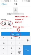 Step 3: On the merchant’s payment page, you need to enter the number of payment. Then tap “确认付款” (confirm the payment). The style or structure of this page may be different from the following one according to the third party service that merchants use (like the following right image).