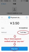 Step 4: Then, it will jump to Alipay’s payment page. You can check the amount of payment here and you can choose your payment method, including balance, Yu’E Bao, debit cards and credit cards, etc. After that, tap “Pay now”.