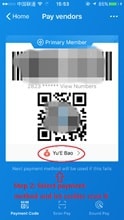 Step 2: Firstly, select your payment method (left image below) and then let cashiers scan your QR code (middle image below) or put your phone face to the sensor (right image below). (Attention: This QR code is only used to pay instead of receiving money. Do not let others scan it except cashiers. Do not do screenshot and send it to others.)