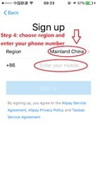 Step 4: Please choose the region of your phone number. Then enter your phone number which is able to receive SMS in Mainland China.