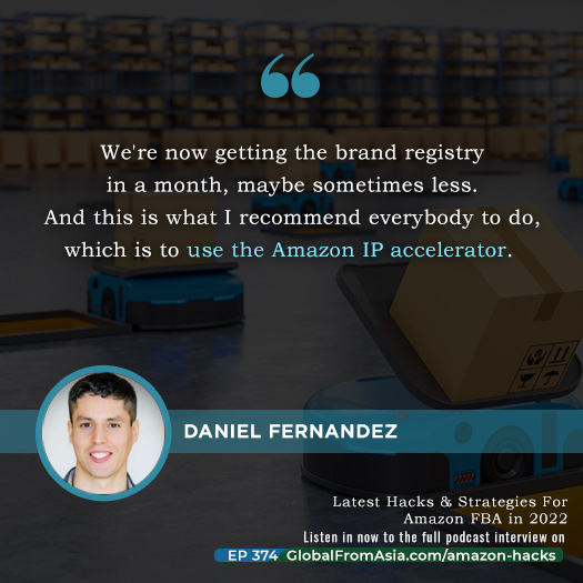 [00:08:16] We don’t do that anymore. We’re getting now brand registry in a month. Maybe sometimes less. And this is what I recommend everybody to do, which is to use the Amazon IP accelerator. It’s not hard to find. You can just Google, Amazon IP accelerator and make sure you start the process from there. If you, if you start a process outside, you will not be able to do this.