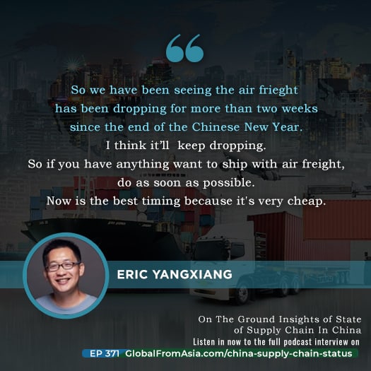 [00:17:25] So, you know, there’s of course, air and ocean, I think Aubrey will talk to you about ocean, but let’s talk, start [00:17:30] with, you know, air freight from China, you know, I know. Oh, this, I think to the US and other places, you know, just maybe we can talk about some rates now and, and, and, you know, cartons of S you know, the feasibility things you’ve been seeing timeframes.