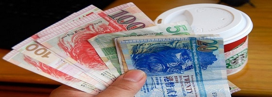 Hong Kong Dollars (HKD). The Hong Kong dollar has a fixed peg to the US dollar at approximately 7.78/7.8 HKD/USD. So I round up to 8 when doing business and call it a day for quick conversions. The notes are bright colored. You can see that they have different banks backing the notes – such as Standard Charter and HSBC.
