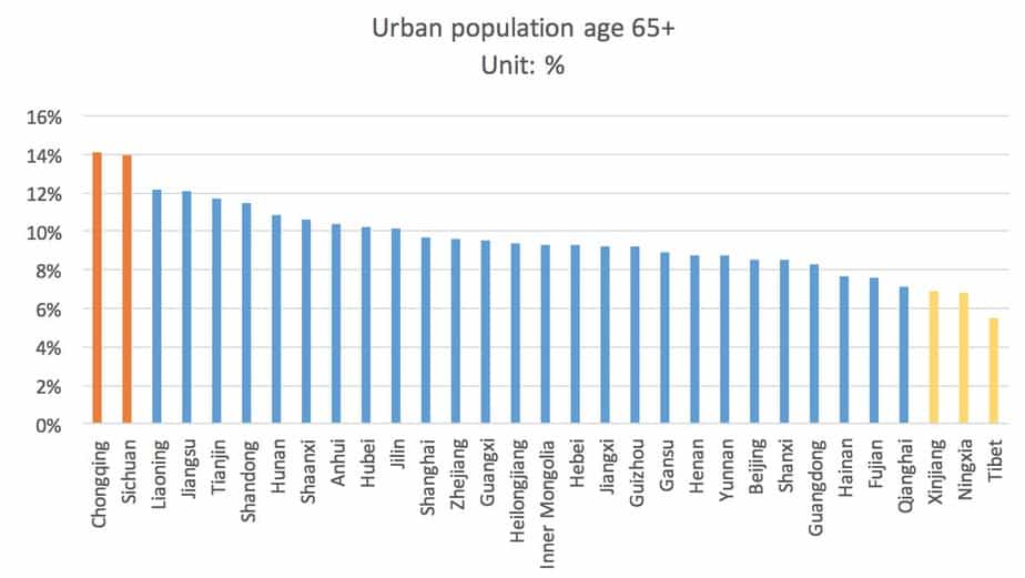 Sichuan and Chongqing have entered Aged Society with +14% elder’s population. 26 out of the 29 remaining regions are already in Ageing Society, with elder’s population between 7% – 14%. Only three provinces, namely Xinjiang, Ningxia, and Tibet, have an elder’s population of less than 7%. Moody’s estimates that China will reach Aged Society with 16.2% population above 65 by 2030. Because of this, there are huge business opportunities in China’s elderly care, products, and services.