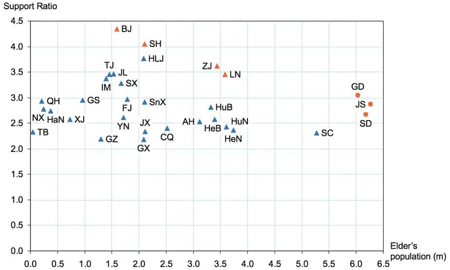 The opportunity, in my opinion, lies on the “efficient frontier” of support ratio and elder’s population. This efficient frontier includes Beijing, Shanghai, Zhejiang, Liaoning, Guangdong, Jiangsu, and Shandong. It balances the potential market size and affordability. It is no surprise that these regions (except Liaoning) also have the highest economic growth in the country. They are the destinations in China’s urbanization. With young workers migrating to these regions, these regions are more likely to be able to slow down the drop in support ratio.