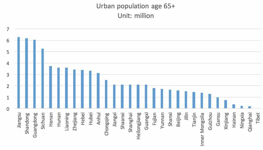 Jiangsu, Shandong, Guangdong, and Sichuan provinces are leading with 5+ million elder’s population each. Chongqing, Tianjin, Beijing, and Shanghai municipal cities each has 1.5+ million elder’s population. The elder’s populations there are also more concentrated (geographically) than other provinces.