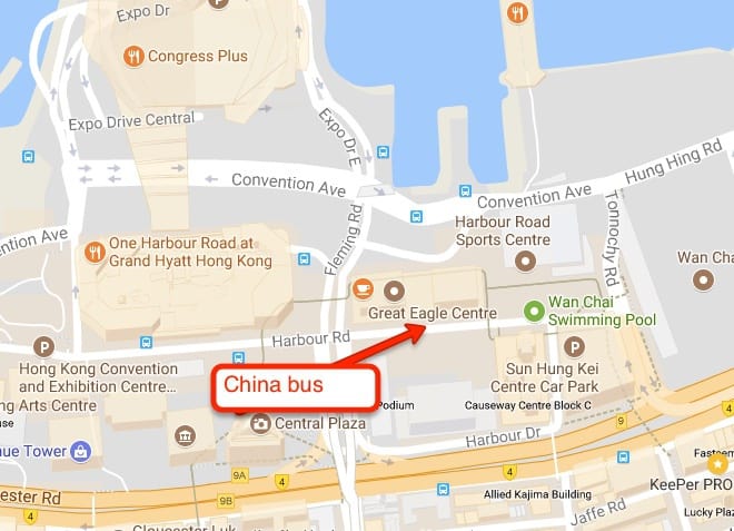 To find the bus in Wan Chai – currently the new bus station is under construction – so it is on a street outside of Great Eagle Center