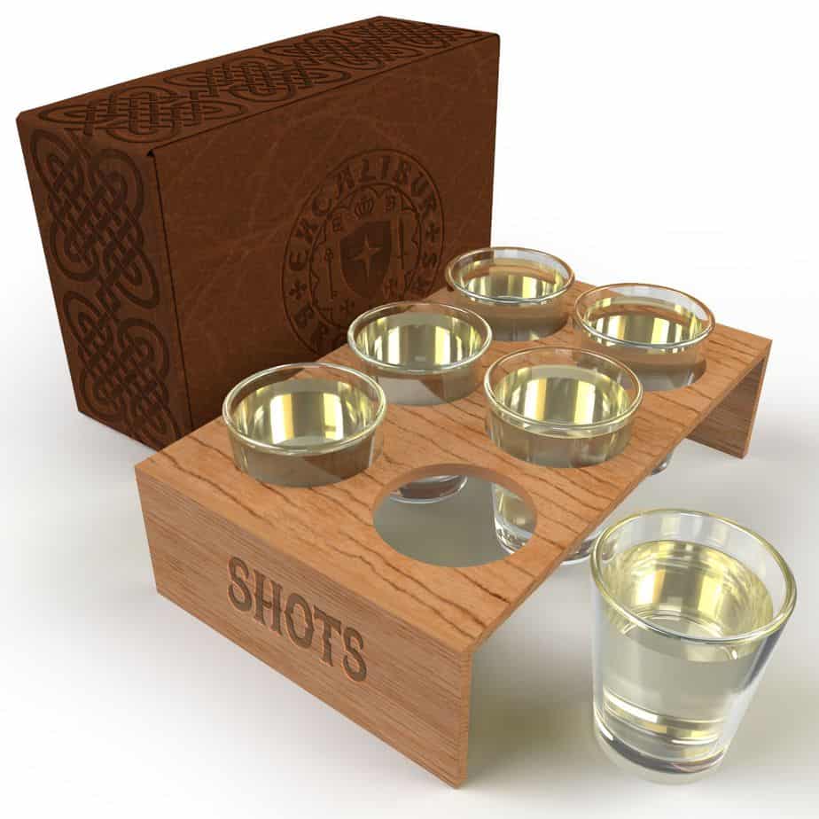 [00:19:39] As again, it’s not totally finished. This is PU polyurethane not genuine leather. So literally just today, the factory has sent us pictures of the flask with genuine leather, with the EB logo, Excalibur Brothers logo on the bottom right of it. But it will also come with these shot glasses inside and a little funnel and a nice gift case.