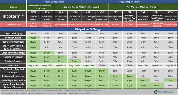 For an easy look-up and easy to understand format, you can check the chart below. The chart shows at which point the risk is transferred from seller to buyer, the obligations and charges and which party is responsible.