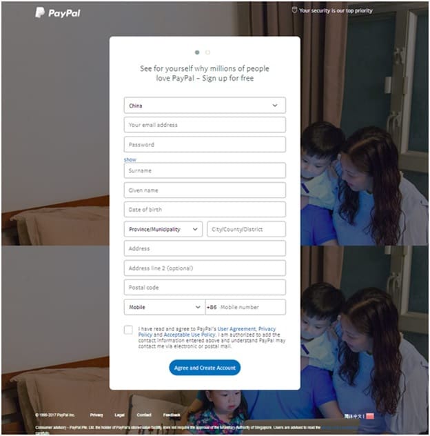 Signing up for a Paypal account is free and easy. With that being said, to create a new PayPal account based in China you can follow these two steps: