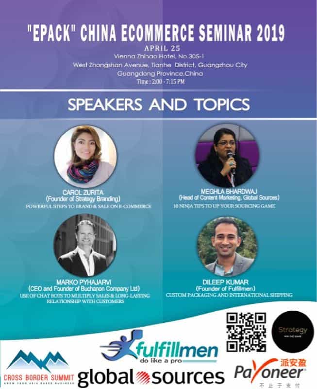 Epack China eCommerce Seminar April 25th,2019 in Guangzhou is Organised by Fulfillmen, a China Based eCommerce Order Fulfillment Center in association with Strategy Branding, a successful Brand Marketing Company for e-commerce.
