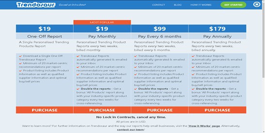 If you only need a one-time report to try-out Trendosaur service, then you can purchase a single personalized Trending Products Report for a price of USD 19. The report will be available online for you to download, in pdf format, once you completed the purchase. It includes a list of products with the suggested suppliers and pricing information.