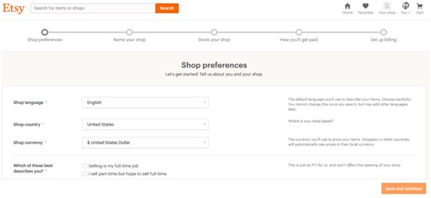 There are 5 tabs to complete / fill out to open a shop: Shop preferences, Name your Shop, Stock your Shop, How you’ll get paid, and Set up Billing.