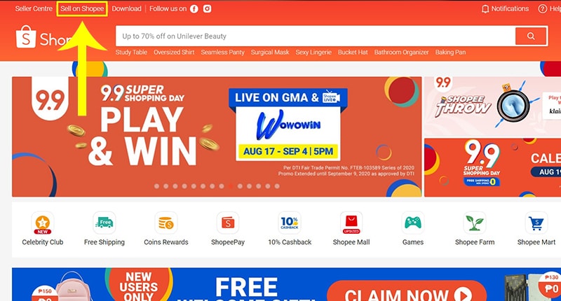 The first thing you need to do is head on over to the Shopee website. At the upper left side, you’ll find a button that says “Sell on Shopee”. Go ahead and click it.