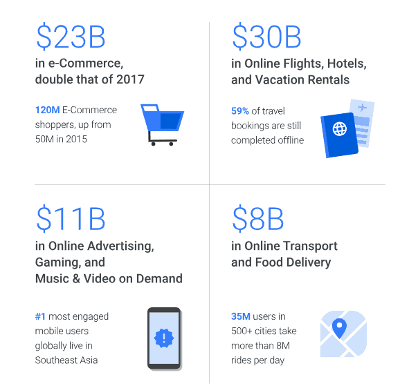 Of all the sectors under Southeast Asia’s internet economy that includes online travel, ride hailing apps, online advertising, music & video subscription, among many others, e-commerce remains the fastest in terms of growth. It has expanded significantly from year 2015’s $5.5 billion in GMV to over $23 billion in 2018. That is a growth of 4x in just three years.