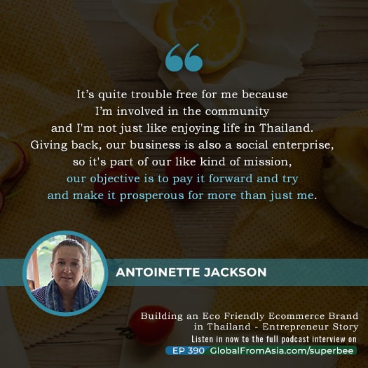 And now your [00:00:30] host, Michael Michelini. How’s everybody doing? You know, I’ve been in Thailand now, back in Thailand for a few months, try to have more content about Southeast Asia, you know, sellers here. Today’s a really great episode. And, uh, we went out onsite. Antoinette Jackson, she’s the founder of Superbee.Me using natural beeswax products, environmental friendly products, manufactured here in Chiang Mai Thailand.[00:01:00]