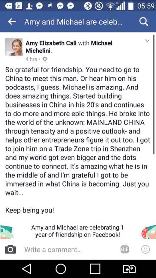 I just got off my Google Chat with Michael and am so happy. He has taken his practical experience living and doing business in China and applied it directly to my situation. He just saved me LOTS of research and headaches. Thanks to his direction and resources, I know that by our next call, I will be closer to making my dreams a reality. Also, the fact that I’m connected with Michael who has made his dreams his life, I now feel an Even Bigger Kick in the butt to go after mine as well! With one life to live, talking with Michael is invaluable if you’re passionate and serious about making a positive impact in the Chinese market.