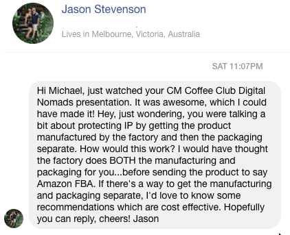 Hi Michael, just watched your CM Coffee Club Digital Nomads presentation. It was awesome, which I could have made it! Hey, just wondering, you were talking a bit about protecting IP by getting the product manufactured by the factory and then the packaging separate. How would this work? I would have thought the factory does BOTH the manufacturing and packaging for you…before sending the product to say Amazon FBA. If there’s a way to get the manufacturing and packaging separate, I’d love to know some recommendations which are cost effective. Hopefully you can reply, cheers! Jason