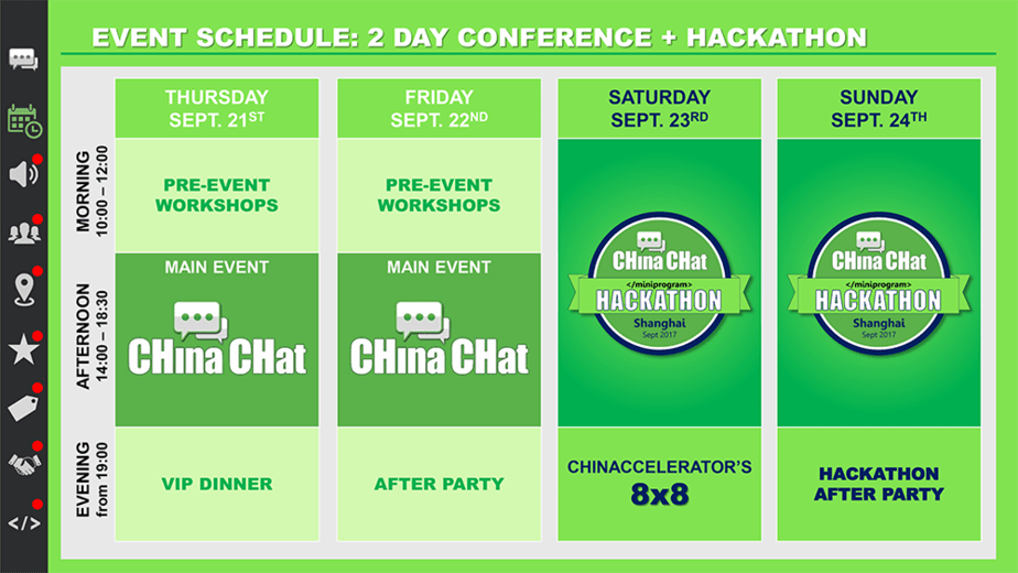 I’m excited to announce that the team at China Channel is bringing back their CHat conference! The dates have been released for Sept 21-22, 2017 followed by a Wechat App hackathon!